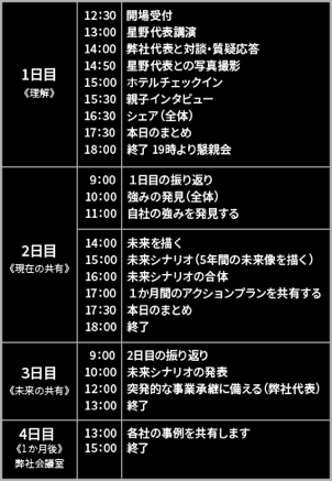 日々の業務から距離を置き、いつもと違う場所で、将来の会社のありたい姿を後継者と共に考えてみませんか。会社ではどれだけ時間をかけても答えの出なかった最高のビジョンがこの2泊3日で見つけられます。